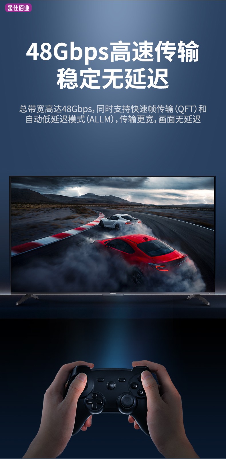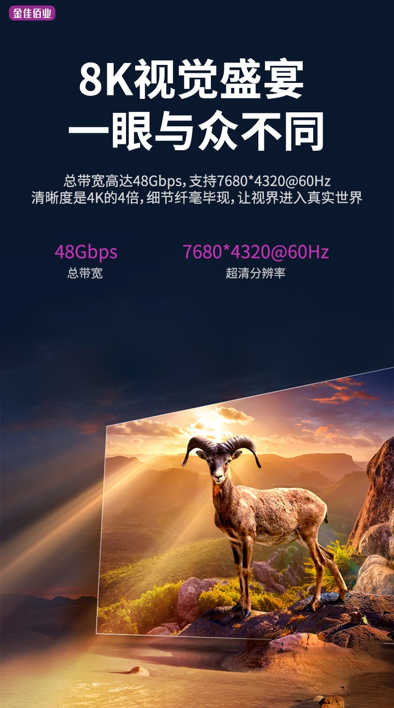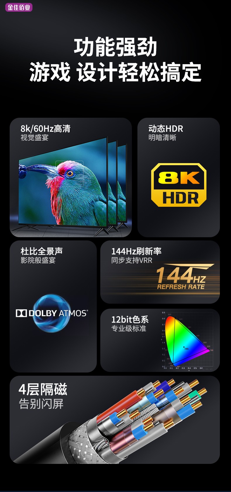 支持分辨率:8K/60Hz、4K/120Hz、2K/144Hz 3D 48Gbps