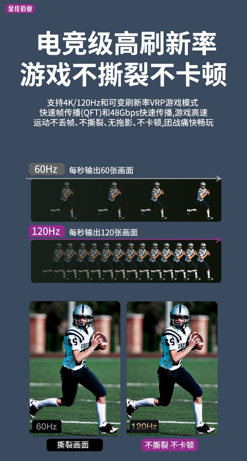 2.支持分辨率:8K/60Hz、4K/120Hz、2K/144Hz 3D 48Gbps