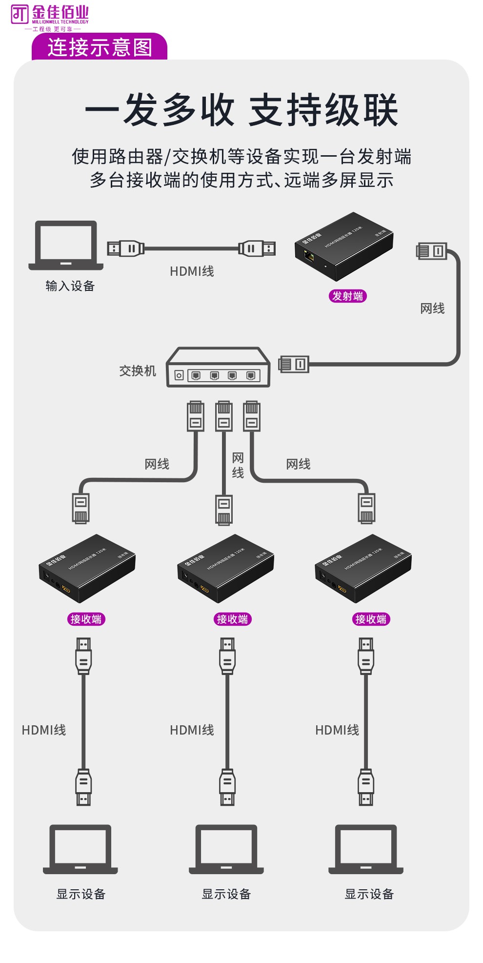 3.支持進交換機級聯(lián),一發(fā)多收多屏顯示;