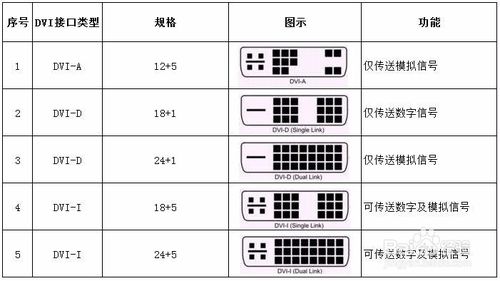 上面講到的是DVI線的類型,下面我們來說說DVI先的規(guī)格。DVI線共有5種規(guī)格,分別對應(yīng)的是:DVI-A一種規(guī)格,DVI-D以及DVI-I各有兩種規(guī)格。5種規(guī)格又分別是:DVI-A(12+5)、單連接DVI-D(18+1)、雙連接DVI-D(24+1)、單連接DVI-I(18+5)、雙連接DVI-I(24+5)。