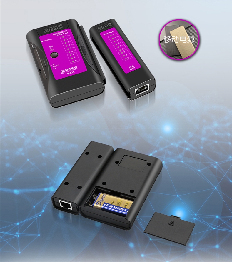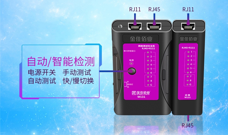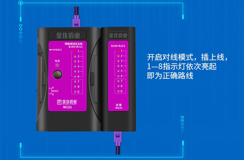 金佳佰業(yè)W131網絡測試儀為網線與電話線二合一多功能檢測工具,可對RJ45網絡端口和RJ11電話端口進行測試,對電話線纜、網絡線纜等進行線路的通斷檢測與判定時,可通過多功能按鍵在手動點對點測試與自動測試之間自由切換,常用于綜合布線施工中。