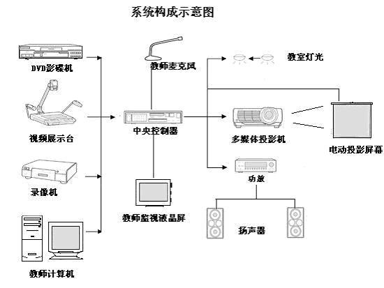 尤其為了讓經濟比較薄弱的學校也能“武裝”自己的 教室,早日全面實現(xiàn)教育現(xiàn)代化,我們設計了一套把普通教室改造成投影多媒體教室的經濟配置方案。普通投影教室的組建以實用、夠用、好用和經濟為原則,因 此,主要選擇以下設備:投影機、視頻展臺、多媒體計算機、中央控制系統(tǒng)、有源音箱和屏幕等。