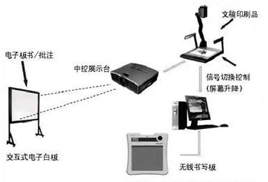 交互式電子白板多媒體教室是一種由計算機及相關技術和一些外圍設備所裝備的教室。它至少包含計算機、交互式電子白板(或交互式書寫 屏)、電子課件、視頻展臺、投影機和其他設備(VGA分配器等)。它還可以包含錄像機、視頻/音頻接收設備、網絡連接設備(接入因特網/局域網等)。