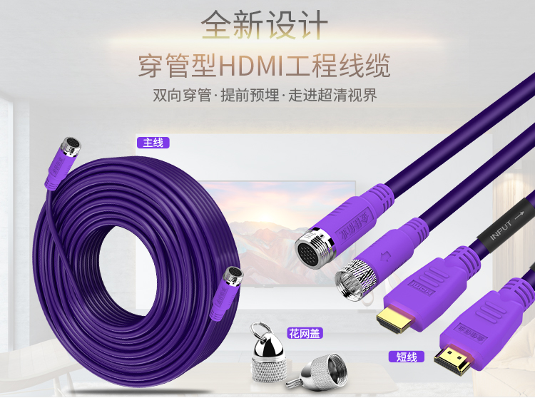再者就是穿管的時候非常方便,常規(guī)的HDMI線穿管的時候由于線頭大小的限制,細一些的管子是沒法穿過的,這對于布線的時候也是一個問題,而穿管HDMI線的話,無需擔心這一問題,金佳佰業(yè)穿管HDMI線配備有花網(wǎng)蓋,扭上之后直接使用鐵絲綁住,鐵絲穿過管子,輕輕一拉,即可將HDMI線穿過管子,輕松助您完成穿管布線。