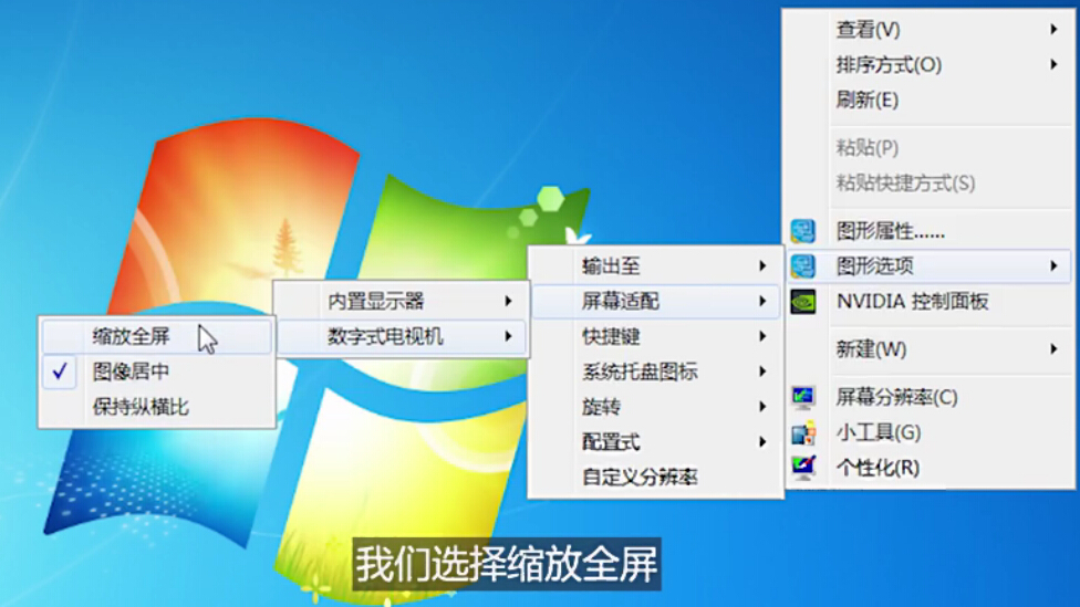 有的小伙伴在設置好之后會發(fā)現個問題,那就是電視顯示的不是全屏,會有黑邊,對于有強迫癥的人來說,這是非常難受的問題了,下面金佳佰業(yè)就叫大家怎么解決黑邊問題。在桌面鼠標右鍵單擊-圖形選項-屏幕適配-數字式電視機-縮放全屏 。如下圖示: