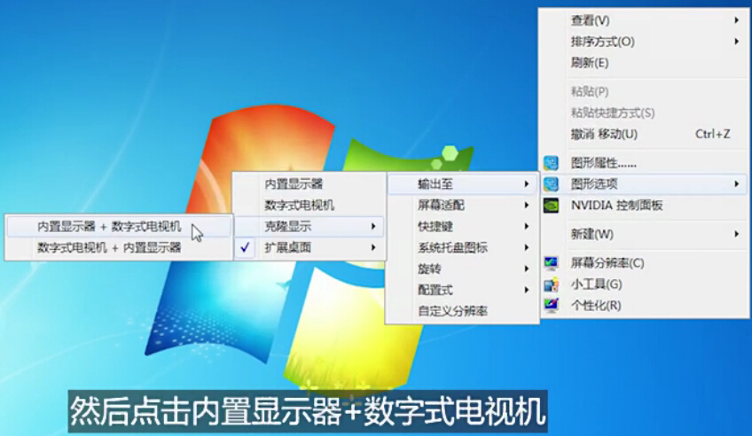 電腦桌面鼠標右鍵-圖形選項-輸出至-擴展桌面-內置顯示器+數字式電視機;這樣就可以了。