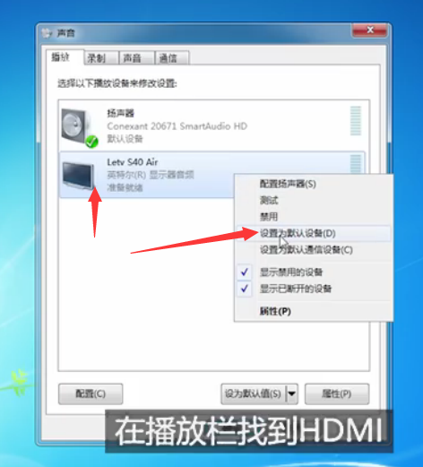 有的小伙伴在上面的都完成之后,突然發(fā)現電影沒聲音,如果遇到這種情況的話,在電腦右下角的喇叭圖像上右鍵點擊,然后選擇播放設備,鼠標右鍵單機揚聲器下面那個,選擇設置為默認設備就OK了,這樣電視就有聲音了,如果你要給電腦接入外接音響,接入之后沒有聲音的話,回到剛剛的頁面,右鍵單機揚聲器,選擇設置為默認設備播放即可。