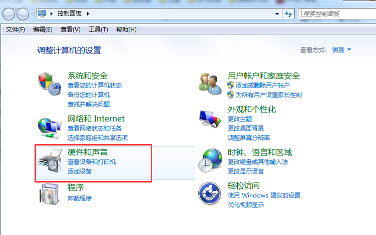 1、點(diǎn)擊電腦右下角 “開始”鍵,進(jìn)入控制面板,然后點(diǎn)擊“硬件和聲音”;